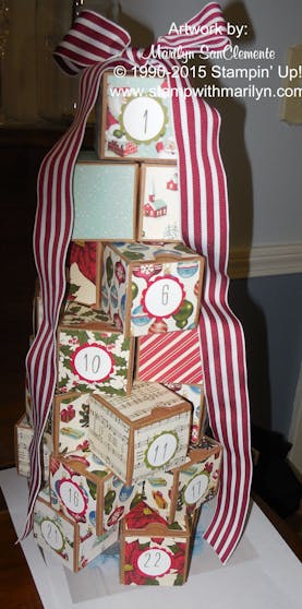 I have been making this 3D Advent Tree for a few years now and have also made them at my church for the craft fairs! All you need is 25 2" square boxes and some decorative Holiday paper!