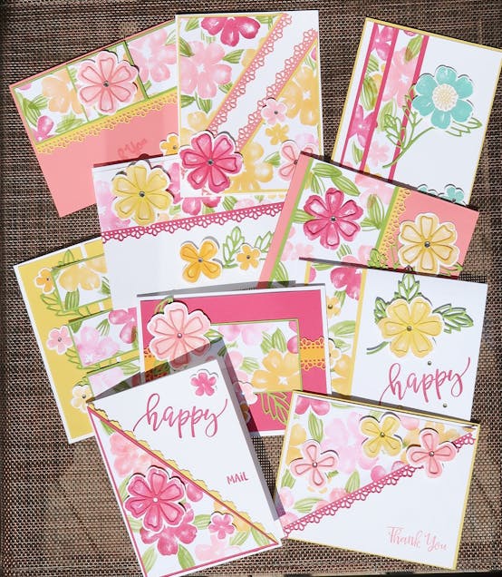 Learn how to make 10 Stunning cards using one sheet of Designer paper or one sheet of Hand Stamped Cardstock.